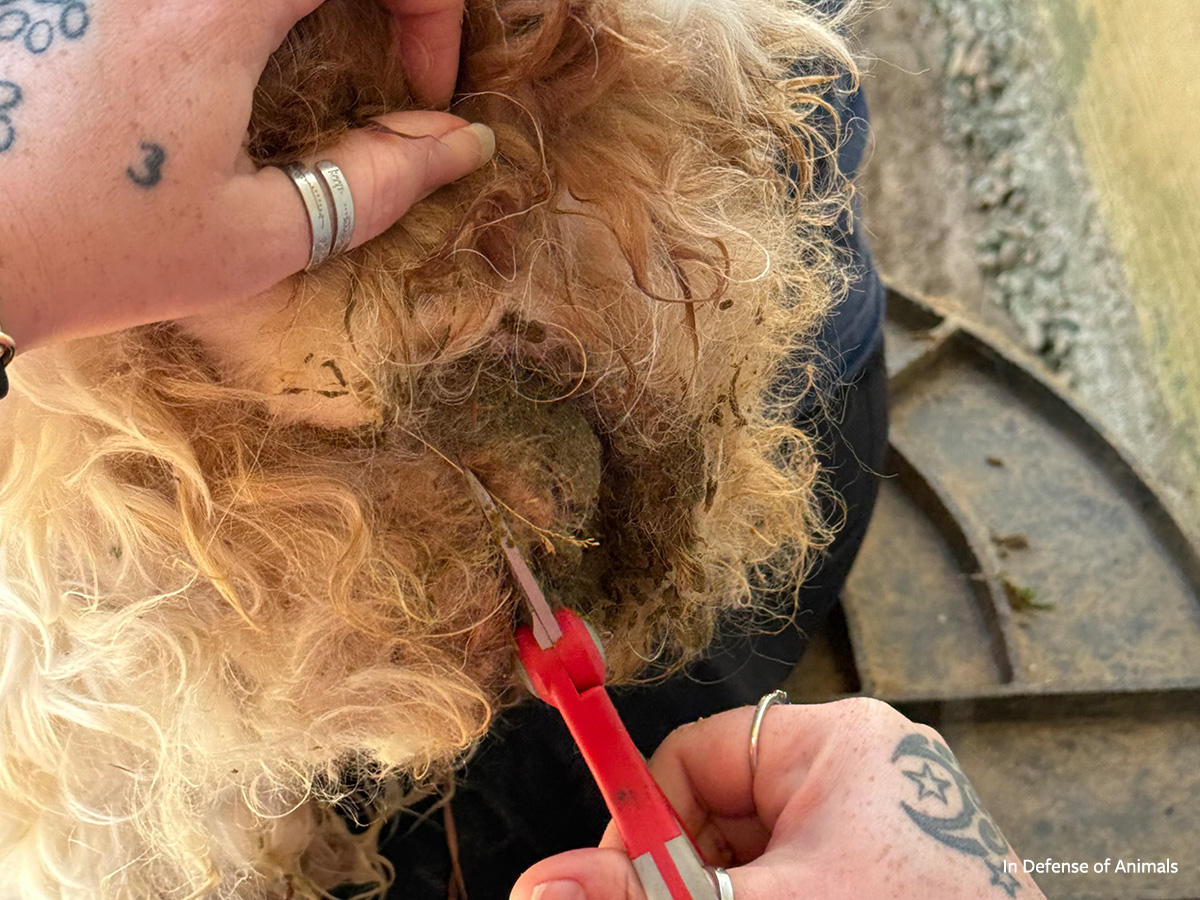 Otis and Baxter were filthy and severely neglected. Otis, in particular, was in obvious distress. What we thought was matted fur was actually matted feces that was so thick and compacted that he couldn’t properly relieve himself. Our caregivers began the painstaking process of trimming away the hardened mass. Despite the discomfort, Otis remained calm, almost as if he knew we were trying to help.