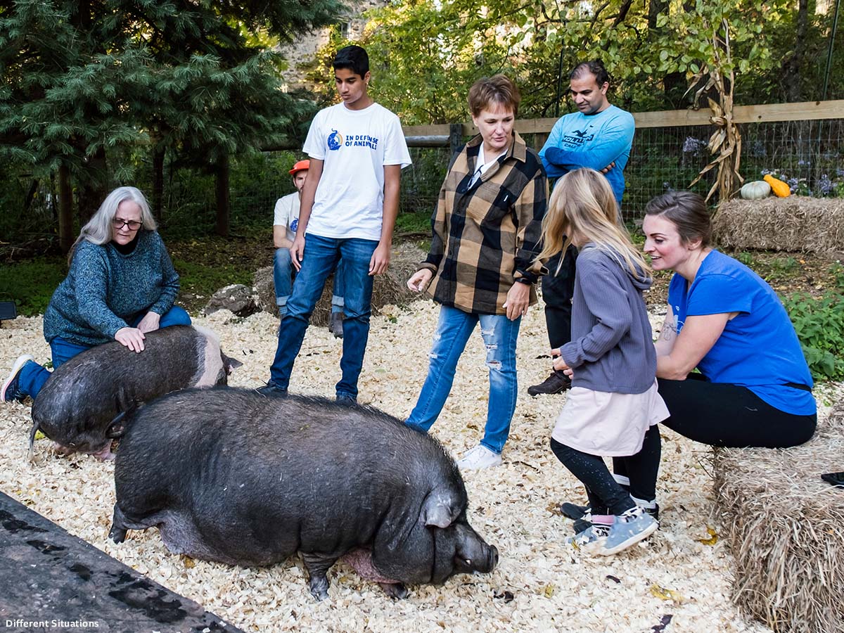 Two elderly pot-bellied pigs who suffered for years at the park were the first to be transferred, back in July 2022. We later sponsored a housewarming party for Cosmo and Newman at Fluffy Butt Rescue in Milford, New Jersey. Attendees celebrated the pigs’ rescue and welcomed them into a large, insulated, state-of-the-art wooden house purchased by donations, including a generous contribution from In Defense of Animals. The move would be life-changing for the pigs. They were put on anti-inflammatory medications and supplements for their skin and joints, as well as a healthy diet, and their condition began to improve.