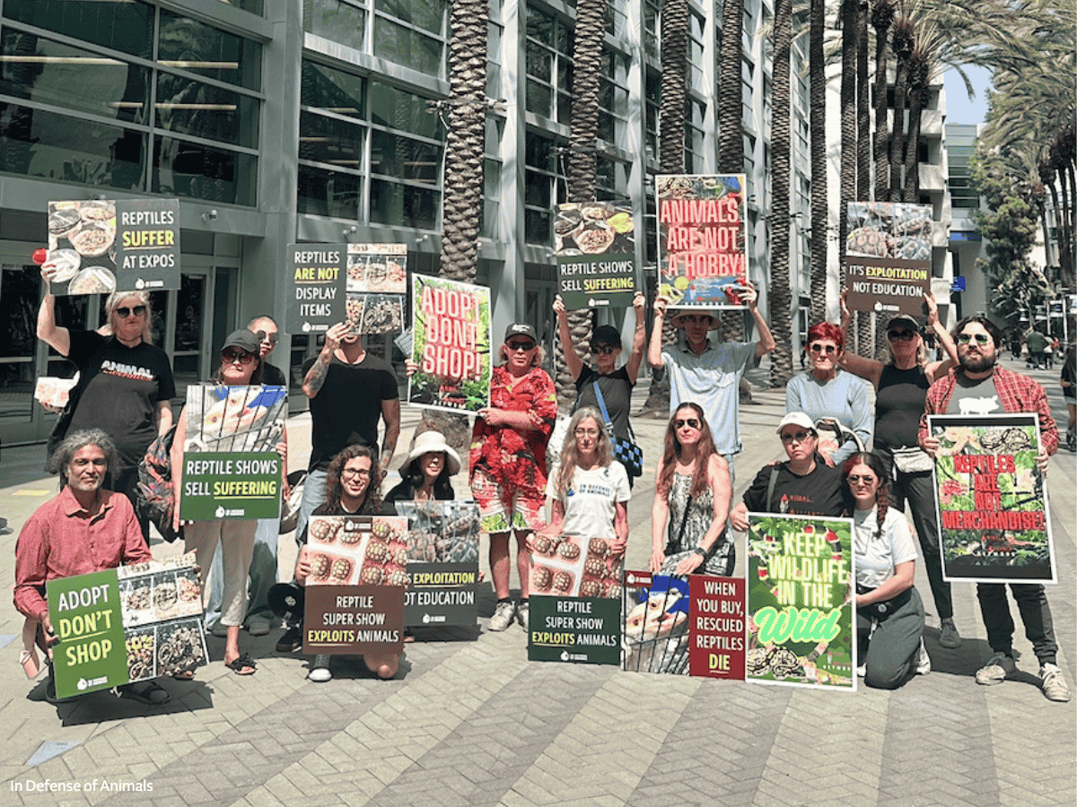 On Saturday, twenty demonstrators backed by In Defense of Animals and Animal Alliance Network held signs, distributed 250 flyers, and urged visitors to adopt reptiles from shelters and rescues instead of supporting the harmful exotic animal trade. Over 280 Orange County residents have already contacted the City Council urging a ban on the sale and display of exotic animals.
