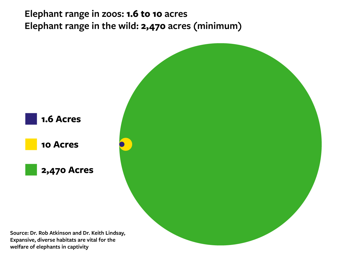 “Elephants evolved to live in spaces 1,000 to a million times bigger than even a large zoo enclosure of 10 hectares (24.7 acres).”