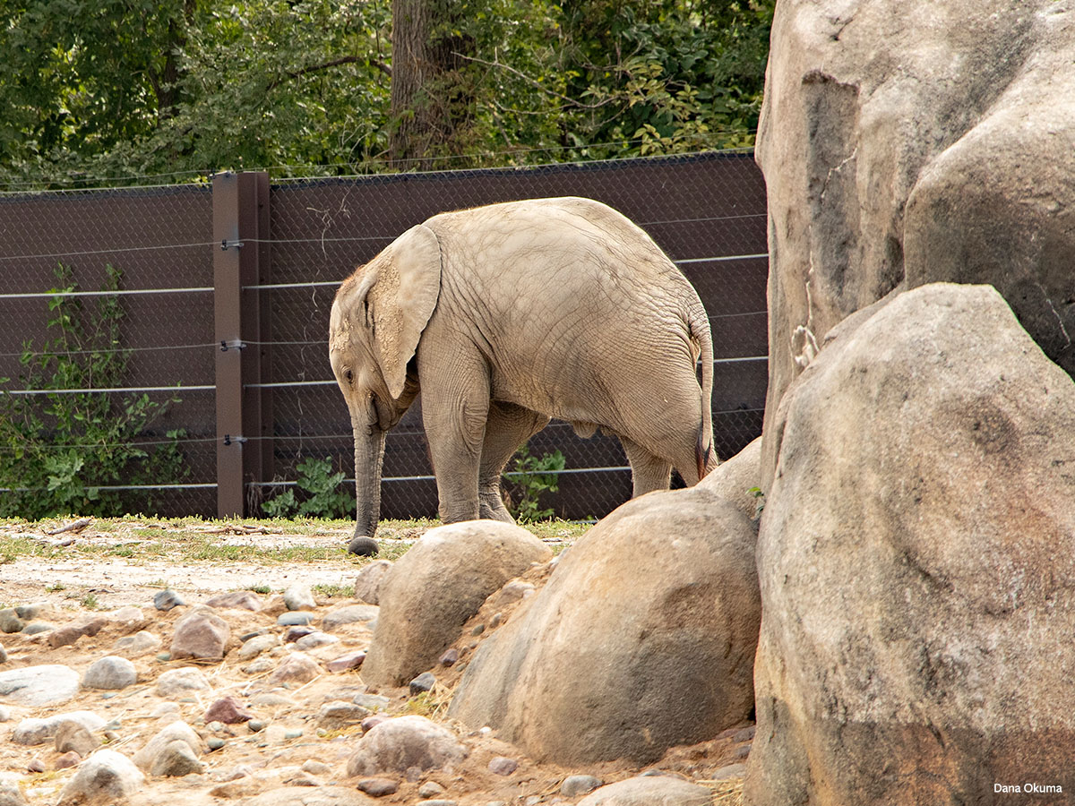 Wild elephants can roam up to a hundred miles each day. Yet these three elephants are restricted to an outdoor area of under 2 acres. During Milwaukee’s bitterly cold winters, the elephants often prefer to be indoors. To understand how small 2 acres is, calculations suggest the Milwaukee Zoo elephants can walk directly from one end of their exhibit to the other in approximately 40 seconds.