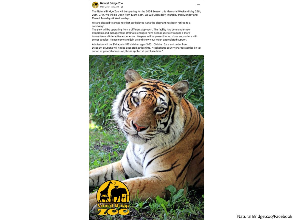 Now, Natural Bridge Zoo has falsely claimed that Asha was sent to a sanctuary. A post on May 23 reads, “We are pleased to announce that our beloved Asha the elephant has been retired to a sanctuary!”