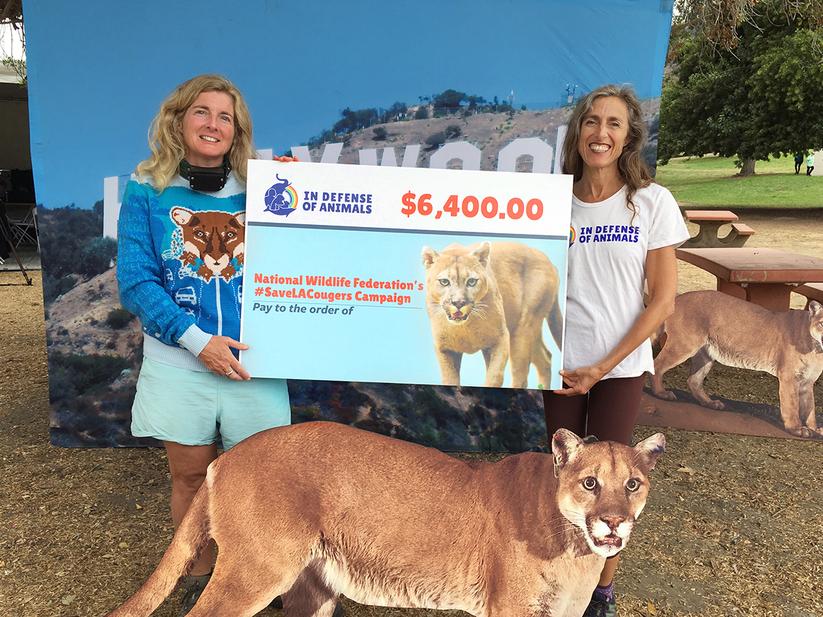Thanks to your generous donations, In Defense of Animals was able to give the National Wildlife Federation’s #SaveLACougars Campaign Leader Beth Pratt a check for $6,400 on the homestretch of a marathon fundraiser to build the largest wildlife crossing of its kind in the world. The Wallis Annenberg Wildlife Crossing at Liberty Canyon will reconnect a long-fragmented ecosystem and help protect locally endangered mountain lions and other wild animals in the Santa Monica Mountains of Los Angeles, California.