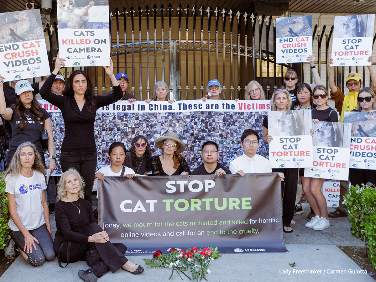 We helped form a global coalition of animal advocacy groups to stop online cat torture, investigate cat perpetrators, and host events to raise awareness. Cat torture videos surfaced on social media in 2023 and have increased exponentially since then. Data shows an alarming 300% more cat torture cases between December 2024 and early 2025, often originating from China, which doesn’t have animal cruelty laws.