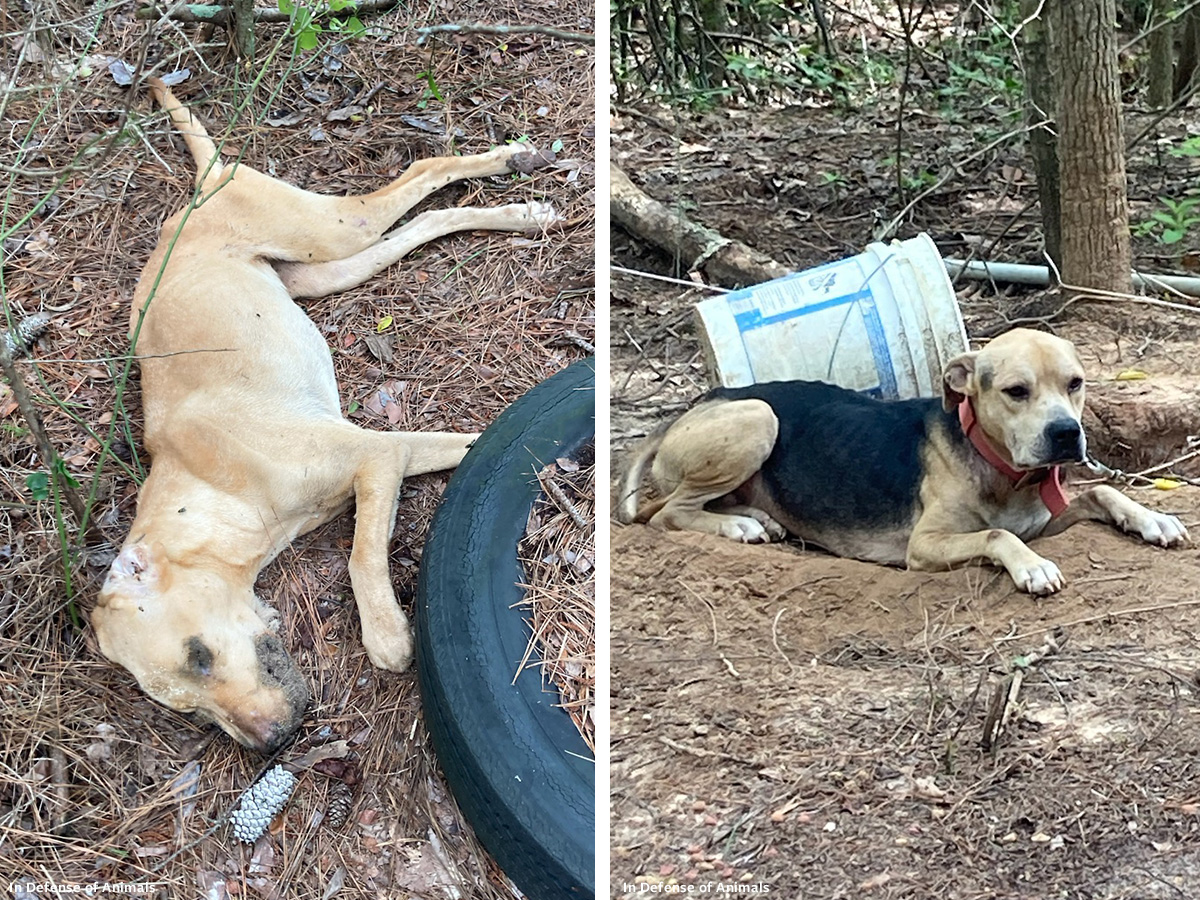 Dozens had been left loose, tethered, and in cages. On a separate property, another 35 dogs were found running around loose with many inside a trailer that was filled with trash, feces, and urine. Ten pups were found deceased and bagged. Two dogs and one puppy were immediately euthanized on-site because nothing could be done to save them. The survivors had been left starving and dehydrated in filth, had fleas and ticks, illnesses and injuries; many tethered dogs had dental problems, likely from trying to chew themselves to freedom.
