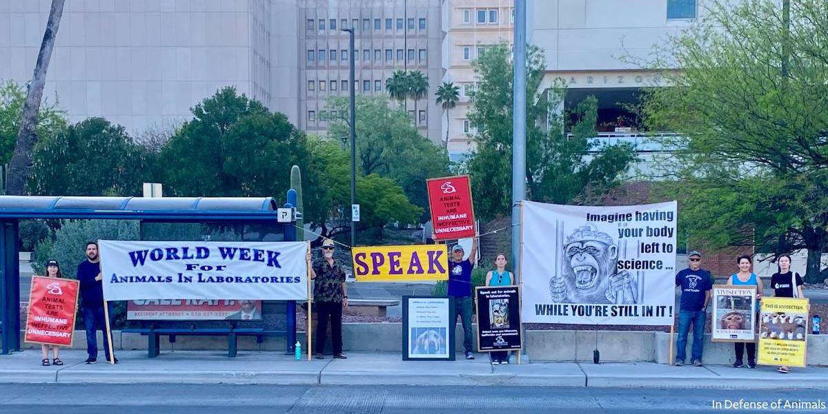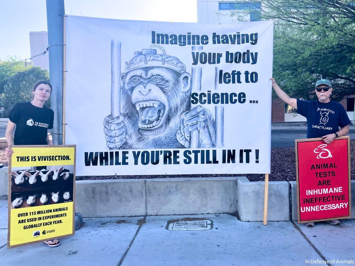 TUCSON, Ariz. (April 26, 2024) — On Thursday, April 25, activists with In Defense of Animals and Tucson-based animal rights group SPEAK (Supporting and Promoting Ethics for the Animal Kingdom) took a stand against extreme animal cruelty at the University of Arizona’s College of Medicine. From brain-mapping experiments on primates to surgical training procedures on live pigs, the university has been thoroughly entrenched in the archaic practice of vivisection on animals, causing unimaginable suffering and death to the involuntary participants.