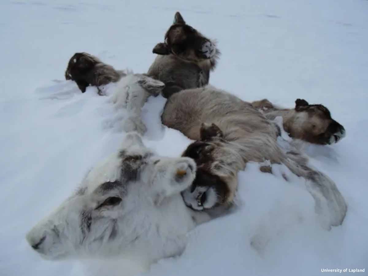 An estimated 80,000 reindeer died in Siberia from starvation. Warmer temperatures caused the nearby Arctic sea ice to melt, and exposed the warmer Atlantic water below. The newly exposed water was released as water vapor into the air, leading to increased cloud production and rainfall. When temperatures dropped drastically over 10,000 square miles of the southern part of the Yamal Peninsula, thousands of reindeer were incapable of breaking through the thick, newly formed ice to access lichen and plants below.